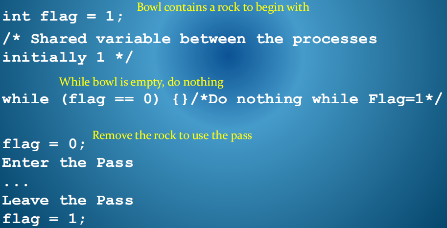 当司机希望进入时,他首先先在自己的碗里掉一块石头,作为他希望使用传球的信号。然后他检查另一个司机的碗是否空。如果是这样的话,他开着火车穿过,走回来,从自己的碗里取出石头。