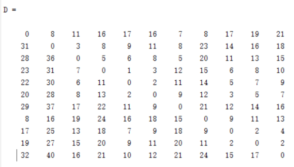 a= [ 0,50,inf,40,25,10; 50,0,15,20,inf,25; inf,15,0,10,20,inf; 40,20,10,0,10,25; 25,inf,20,10,0,55; 10,25,inf,25,55,0]; [D, path]=floyd(a) |