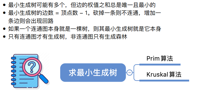 若图中顶点数为n,则它的生成树含有 n-1 条边。对生成树而言,若砍去它的一条边,则会变成非连通