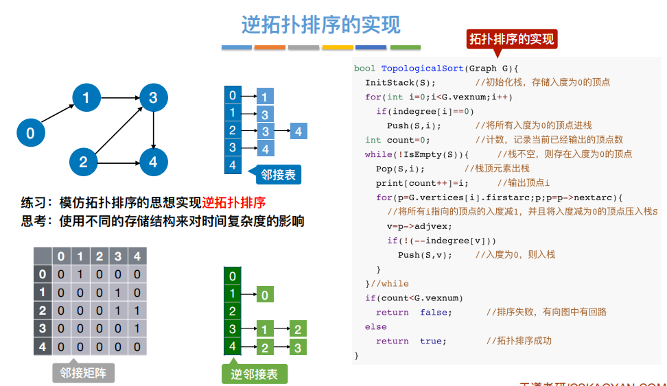 3,拓扑排序的实现: ① 从AOV⽹中选择⼀个没有前驱(⼊度为0)的顶点并输出。 ② 从⽹中删除该顶点和所有以它为起点的有向边。 ③ 重复①和②直到当前的AOV⽹为空或当前⽹中不存在⽆前驱的顶点为⽌。【说明有回路】