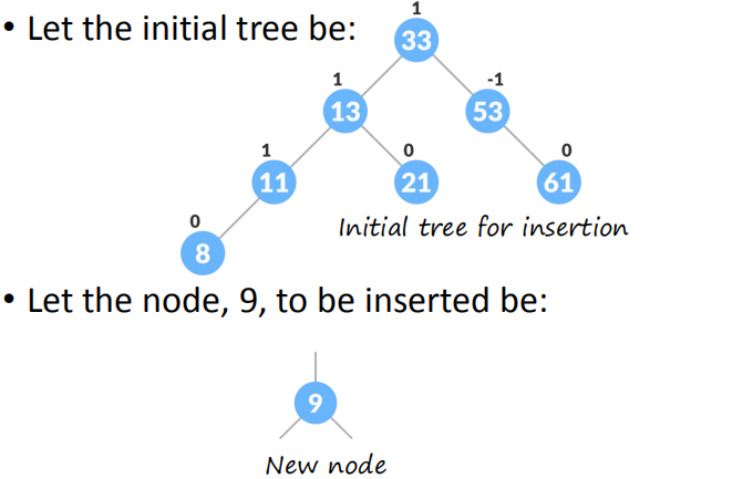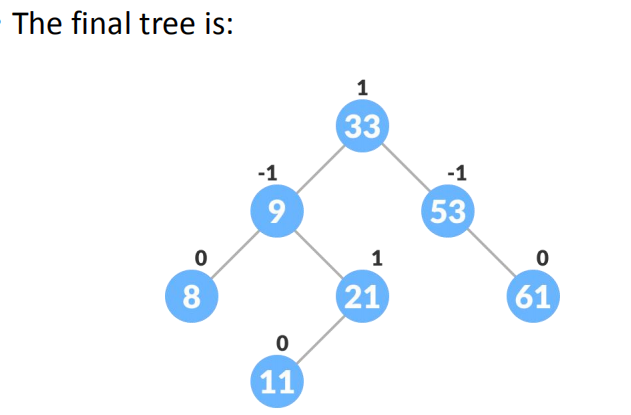 • Delete ==先按照BST要求删除节点,在调整平衡因子== 一个节点始终作为一个叶节点被删除。删除节点后,节点的平衡系数会发生更改。为了重新平衡平衡因子,我们进行了适当的旋转。