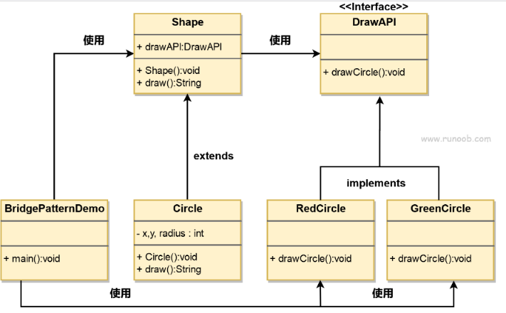 缺点:桥接模式的引入会增加系统的理解与设计难度,由于聚合关联关系建立在抽象层,要求开发者针对抽象进行设计与编程。